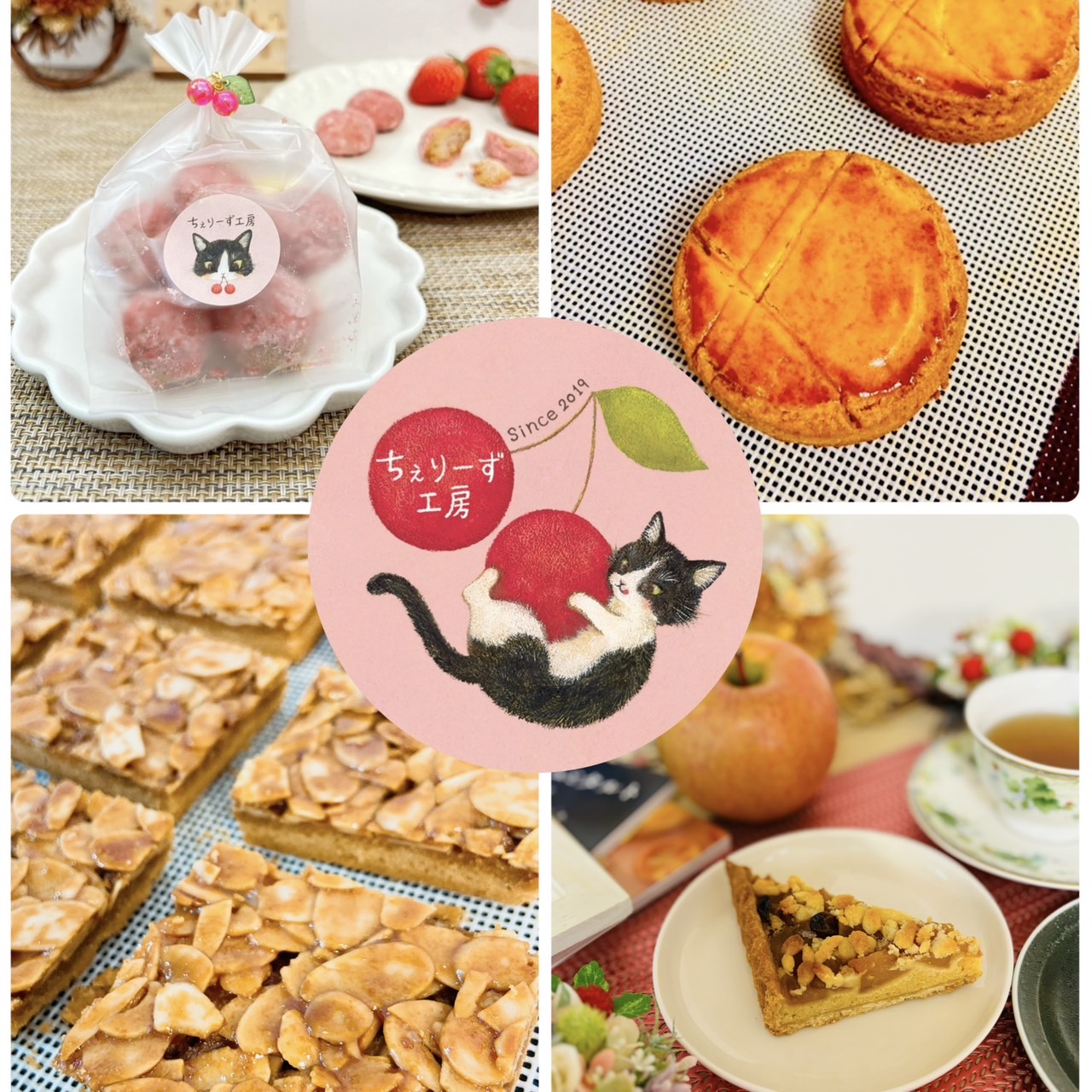 お麩ラスク、米粉クッキー、フロランタン、りんごのタルト、チーズケーキ、ガトーショコラ